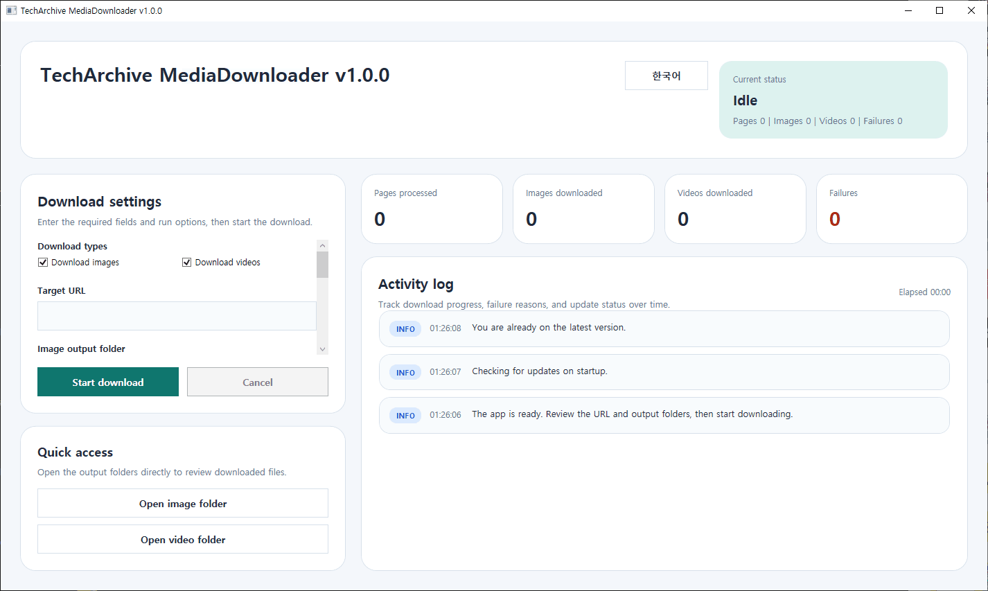 Through the Activity Log window, you can monitor download progress, failure reasons, and update status in real time. It also supports Korean/English UI switching. When the program starts, it automatically checks for updates, and if a new version is available, it can download and apply the update right away.